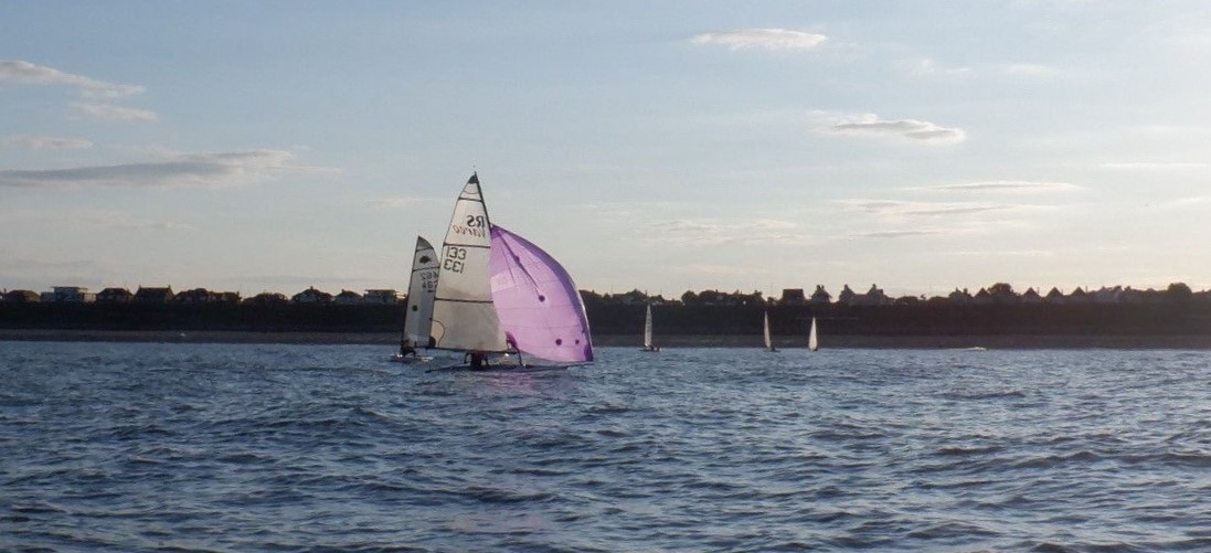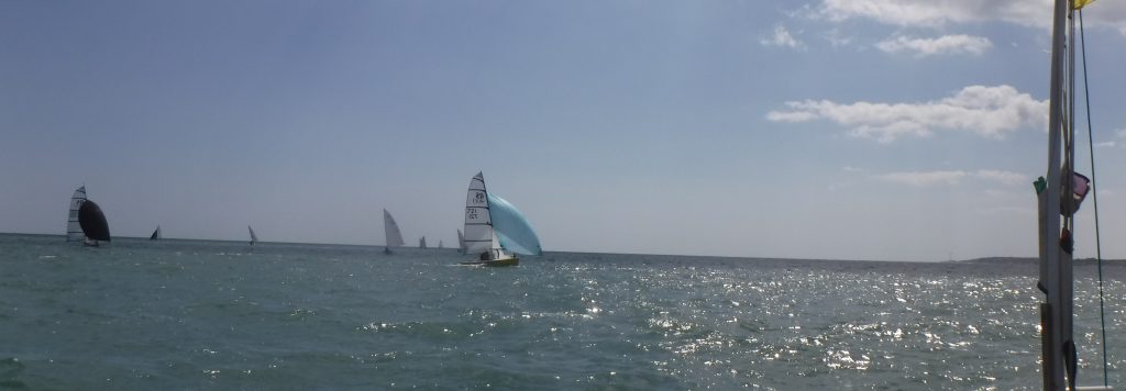 However…….. just before launch time the wind dropped and discussion began as to whether we would make the tide. Steve, keen to try a Vareo offered to take Richard’s rigged and ready vessel out to test the conditions. With everyone looking on Steve did a fine job downwind (and downtide) setting the spinnaker like a pro. The test was to come as he dropped to kite and headed upwind and up tide. Whilst progress was slow it was sufficient to inspire others to launch, although some decided to offer encouragement from the shore and drink coffee.