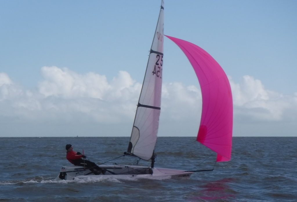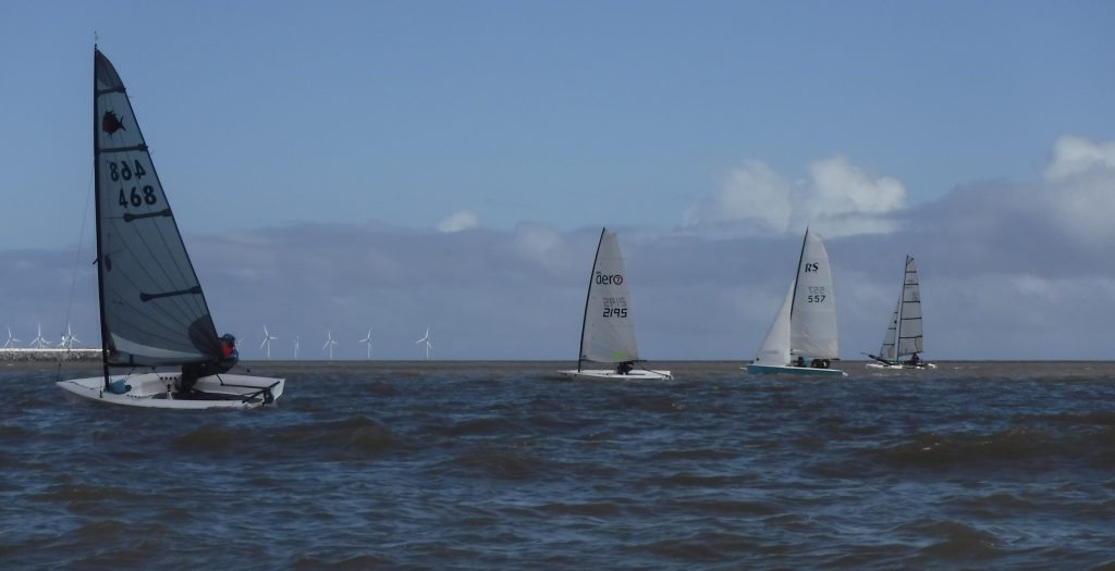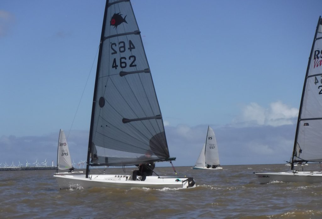 By the time race two started it had clouded over, the wind had picked up to a F4 and shifted a tad to the east. The sea state had become noticeably ‘lumpier’. It was close to HW so the tide had eased a lot. Team Ed sailed another lonely race out in front, lapping almost the entire fleet. Dave & John led the pack with Nick never far behind. The downwind leg provided a great leg for the asymetrics with some exhilarating blasts and fast speeds recorded. The Solutions were having a close tussle with Paul leading after lap one, Richard leading after lap two and a photo finish on the line which went Paul’s way. On corrected time Steve’s pocket rocket took a comfortable win. The next six places were close with Team Ed second and Aero Phil second.